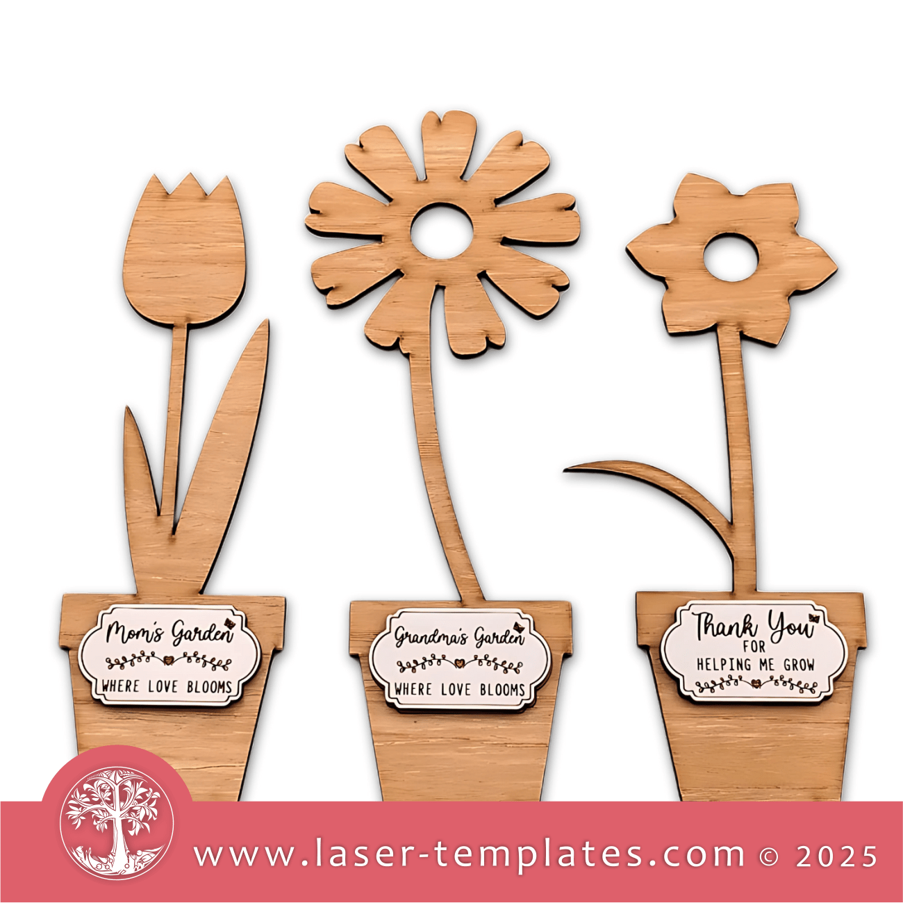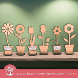 A collection of laser-cut designs – 6 different flowers with stand and 3 tags with engraving included.