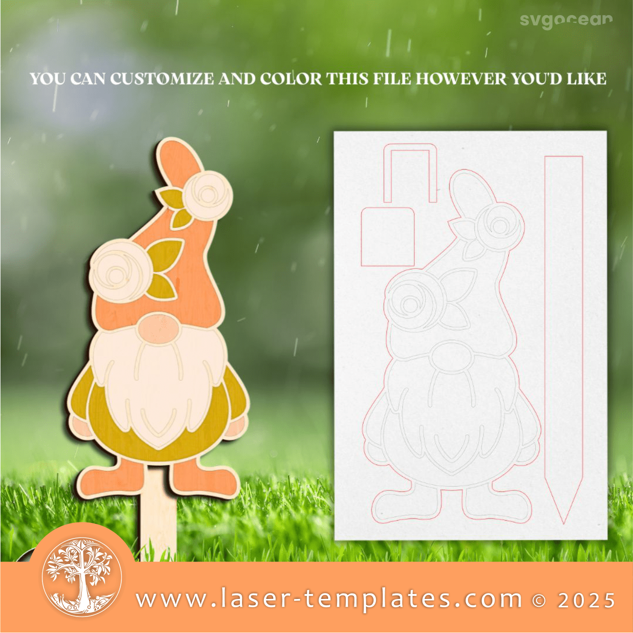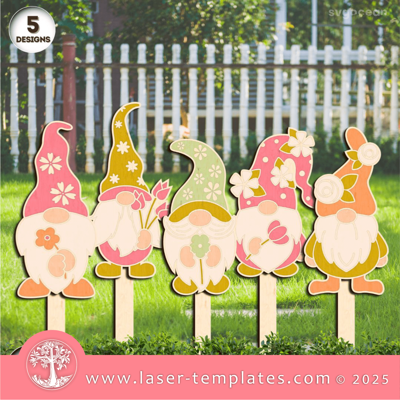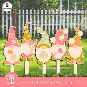 Laser cut and score/engrave template design for garden gnomes with stakes. Perfect for painting, arts and crafts.